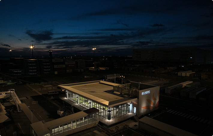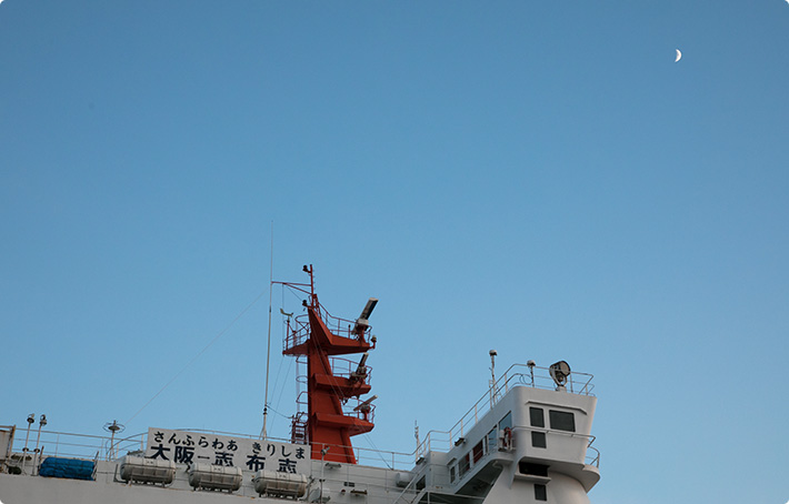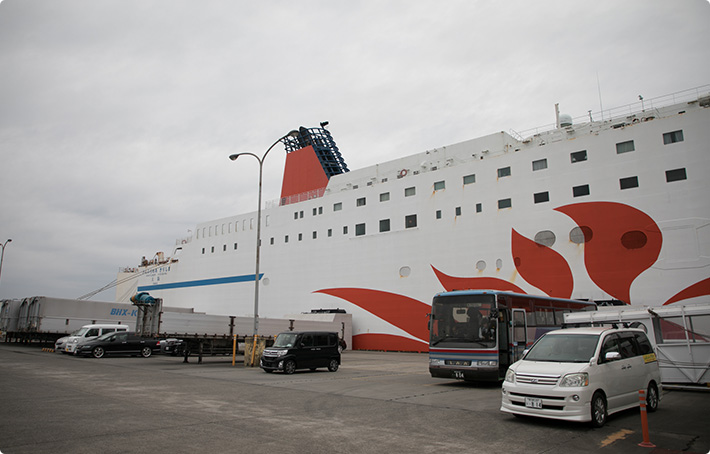 では、早速旅のスタート。鹿児島は大隅半島(おおすみはんとう)の志布志港(しぶしこう)へ航海する「さんふらわあ」には、大阪の中心部から40分ほどの、大阪南港から乗り込みます。受付をするチケットセンターの建物からさんふらわあの乗り場へは、なんとバス移動。あまりにも船が大きいので、乗り場のサイズも規格外です。