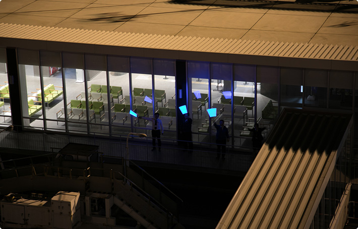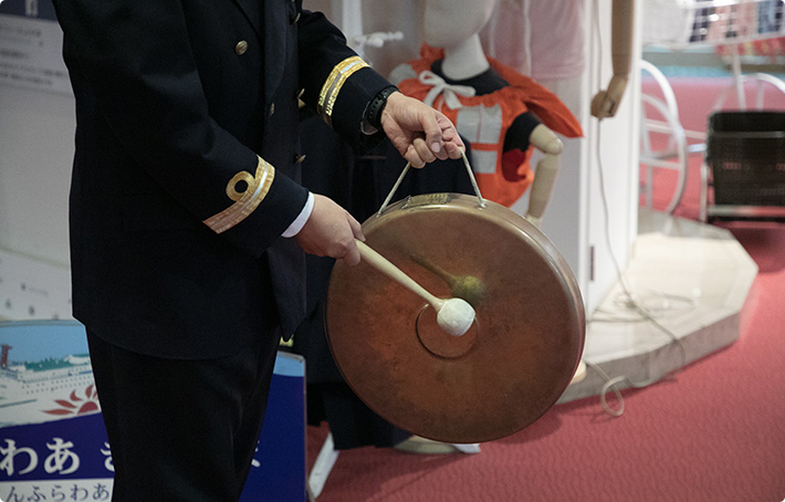 そうこうしていると出港の時間に。地上からはライトを振ってのお見送りが。これ、昼間の場合にはテープセレモニーになるそうです。また、船内ではドラが叩かれました。船内全体に出港を知らせるわけですねえ。