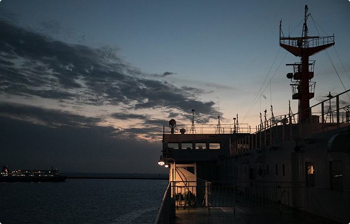 各階のデッキには自由に出られるようになっていて、夕焼けや港・海の眺望を楽しむことができます。見てわかるように、見事な眺め。なんせ最上階は8階相当ですからね。この眺望は船旅の大きなメリットのひとつです。船の煙突をはじめ、デッキの機械類などが力強く、写真映えするのも特徴ですね。好きな人にはたまらない世界です。