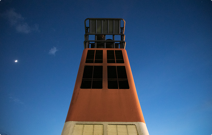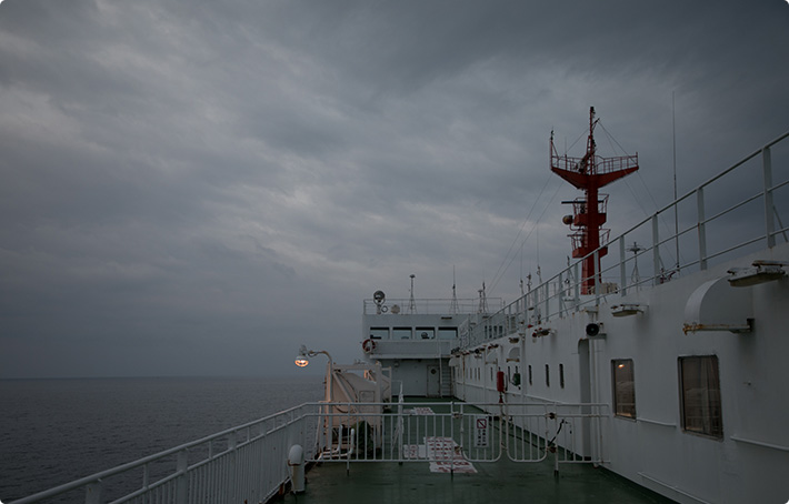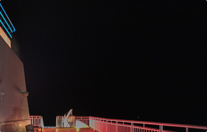 食事のあとはお待ちかね、空の撮影タイム!海上では山中のように外光がほとんどないので、最高レベルの星が楽しめるんですね。ところがこの日の天気は曇り。出港時には晴れ間もあったので、どうかな〜と思っていましたが、残念ながら星は見えませんでした。次の機会、ですね。夏場には星空鑑賞会なんて企画も実施されるみたいですよ。