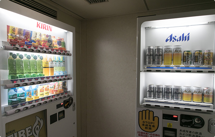 ソフトドリンクからお酒まで、自動販売機も豊富。他にカップラーメンや焼酎の自販機も備えられていました。
