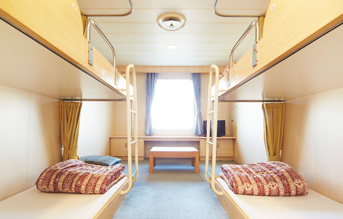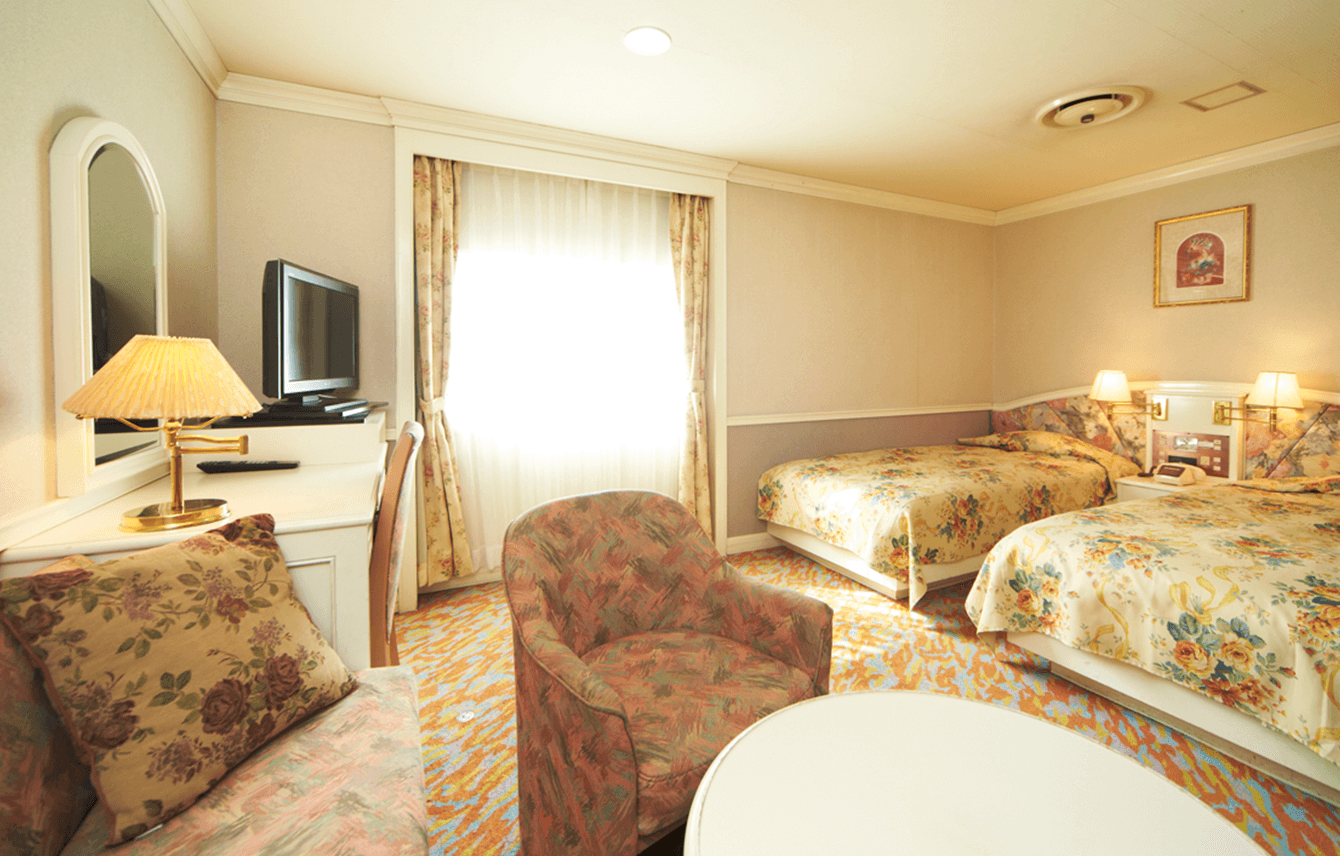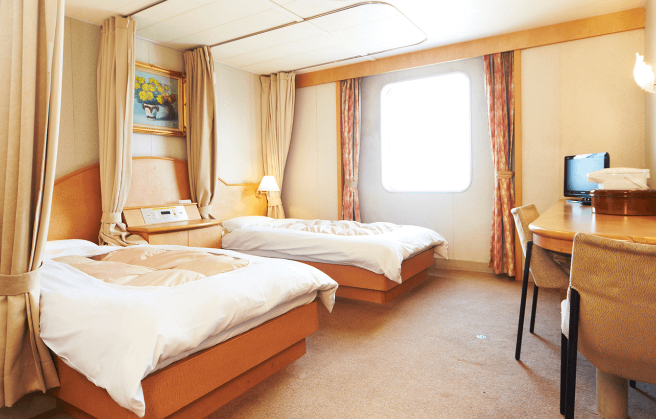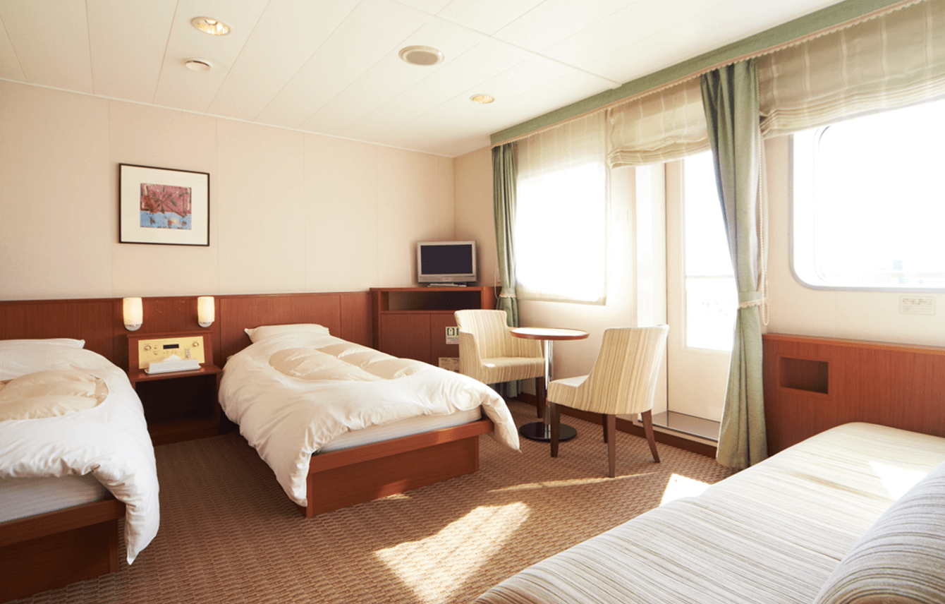 お部屋には窓のあるバスタブつきのお風呂・温水洗浄付トイレがあり、最上級の快適な船旅をお約束いたします。ソファーベッド・プルマンベッドをご使用の場合は4名様までご利用いただけます。
