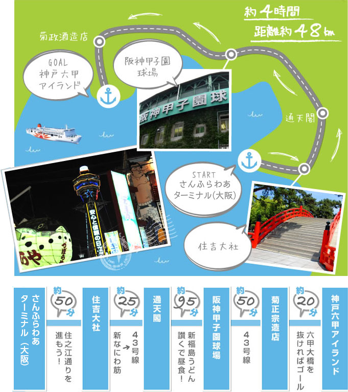“すみよしさん”の愛称で親しまれている『住吉大社』を参拝して、大阪のシンボルタワーの『通天閣』を眺め、『阪神甲子園球場』を抜け、『神戸六甲アイランド』まで楽しみながら進もう!