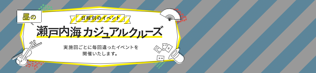 「昼の瀬戸内感動クルーズ」では、航海毎の特別なイベントも開催しております。 イベント 詳しくはこちら お食事 お食事質にこだわり厳選したお食事をご用意。船旅ならではの空間でお楽しみください。 詳しくはこちら