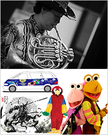 内外で活動しているロック、ジャズ、クラシック、民族音楽のミュージシャンと舞踊家を中心にピアノ、バイオリン、バンドネオン、エレキギター、管楽器の30名の団員で構成。神戸西風見鶏の館アートホールを本拠地におきユニークで特色あるパフォーマンストは国内外から熱く注目されています。本日の編成は、エレキギター、エレキベース、パペットダンスです。