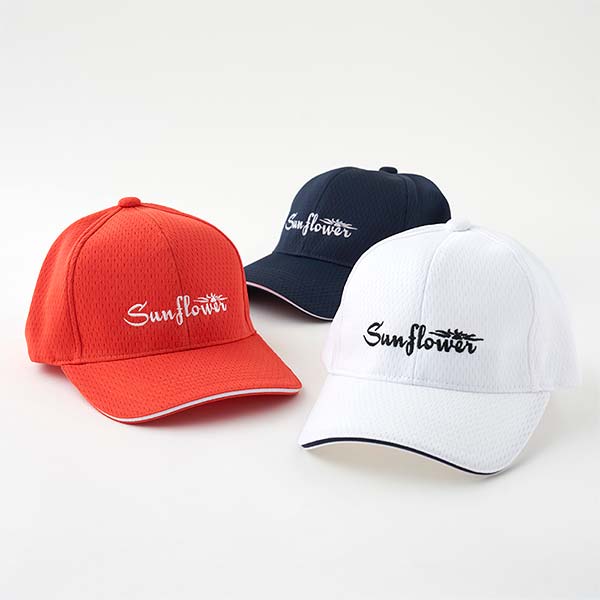 - シンプルな「Sunflower」のロゴに太陽マークを刺繍したキャップ。いつものファッションにスポーティーさを。(3色 紺・白・オレンジ)