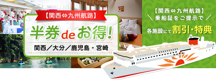 さんふらわあに乗船してくださったお客様への感謝の気持ちを込めて、乗船後にお得なサービスを提供しています!関西~九州航路を利用した後で、提携施設に「乗船証・QRコード」を提示し、「半券deお得!」ご利用の旨をお伝えください。各施設で割引や特典をゲットできます。
