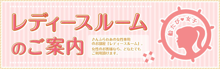 ※幼児のお客様(小学校未就学のお子様)は、男の子でも、レディースルームをご利用頂けますが、ウェルカムドリンクのプレゼントは、乗船運賃をお支払い頂いたお客様へのみのサービスとなります。