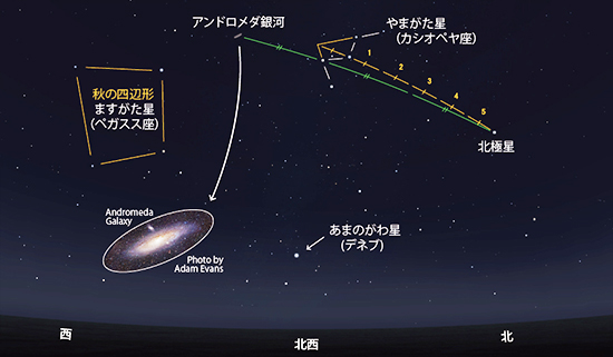 年が明けると、秋の夜空のシンボル・秋の四辺形はずいぶんと西に空に傾きます。日が暮れると西の空にポッカリ浮かびあがってくる秋の四辺形ですが、東の空が冬の明るい星々でにぎやかになってくると、2等星の多いこの領域は、少しさみしく感じられるかもしれません。しかしよく見ると北西の低い空に、夏の名残りの1等星デネブが輝いています。あまのがわ星という名前も伝わるこの星は、その名の通り天の川の中にあり、その流れはやまがた星(カシオペヤ座)から来ています。やまがた星から反対側へは頭上をとおり、東側の五角星、そして冬の大三角へとその流れは続きます。この冬の天の川は、夏の天の川より薄いですが、月明かりのない晴れた夜ならきっと見られるでしょう。さらにやまがた星からは、真北の空で輝く方角の指針、北極星を見つけることができます。また、北極星を見つけることができたら、そこからアンドロメダ銀河の位置を探すこともできます。銀河とは、太陽や星座をつくる星々のように自ら輝く恒星が、数千億個集まってできている星の集団です。太陽や星座をつくる星々は、天の川の星々とともにひとつの銀河(天の川銀河)をつくっていますが、アンドロメダ銀河は我々のすむ天の川銀河の隣の別の銀河です。天の川よりさらに見えにくいですが、月明かりがない夜なら、ぼんやりとその姿が見えるかもしれません。どちらも、目の端でなんとなく見るつもりで眺めてみると、ポワッと浮き上がって見えてきます。