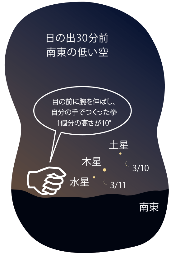 1月の夕空に見えた水星・木星・土星の三惑星が、今月は明け方、日の出30分前、10°前後の低い空に並びます。木星と土星は月初、水平線ギリギリの高さですが、毎日少しずつ高くなり、徐々に見えやすくなっていきます。水星は月初、木星と土星の間に位置しますが、5,6日は木星のすぐそばまで移動するので、その頃が見つけやすいでしょう。その後、少しずつ明るくなりますが、低い位置へ移動し、中旬には見えなくなります。ただしその直前の10、11日は、三惑星に加えて細い月も並び、白む空に束の間のはかない惑星たちの集いが楽しめるます。