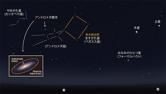 10月に入ると、秋の四辺形が早い時間から空高くに昇り、よく見えるようになってきます。このあたりは明るい星が少なくちょっと寂しい星空ですが、そんな中で大きくぽっかりと口を開けたような四辺形は、2等星の集まりとはいえ、やはり季節のシンボルにふさわしい存在感があります。星座になっているカシオペヤとアンドロメダは、ギリシャ神話のエティオピア女王と姫君で、カシオペヤ座の形は椅子に座る女王の姿、アンドロメダ座は生け贄として岩に縛り付けられた姫の姿とされます。生け贄などと聞くとちょっとドキッとしますが、アンドロメダ姫は天馬ペガススに乗った勇者ペルセウスに無事助けられますのでご安心を。詳しい話はギリシャ神話を参照ください。