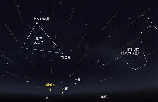 流星群の流れ星は、輻射点とよばれる中心から放射状に流れます。みずがめ座η流星群の輻射点は深夜2時ごろに東の水平線上に昇ってくるので、それ以降未明にかけて見られやすくなりますが、両日とも輻射点に続くように月が昇ってくるので、輻射点が昇る直前の深夜0時ごろから、月が昇るまでの時間帯が見ごろとなります。東の空の夏の大三角のあたりから、頭上にかけての空を中心に眺めるとよいでしょう。