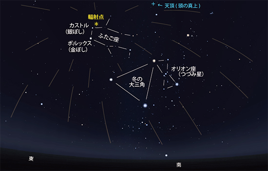 流星群の流れ星は、輻射点とよばれる中心から放射状に流れ出ます。ふたご座と輻射点は20時には東の水平線上に昇っています。ふたご座のあたりは明るい1等星が多く、とても華やかな星空も楽しめます。このあたりの空を流れる流星は短めのものが多く、輻射点から離れた空には、軌跡の長い流れ星が多く流れます。今年は早い時間帯は月の影響があるので、月が西に傾く深夜から未明にかけてが見ごろでしょう。