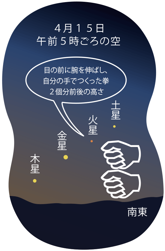 4月に入ると明け方の東の低い空に木星が見えるようになり、先月から見えている三惑星とともに、夜明け前の空が4個の惑星でにぎわいます。月初めは、明けの明星・金星と、火星、土星が集まり目を引きます。しかし惑星たちの動きは速く、日に日にその位置関係が変わっていきます。5日には火星と土星が極接近し、中旬には四惑星が等間隔にきれいに整列して見えますが、下旬になると今度は金星が木星に急接近していきます。日々の変化の少ない星空のなかで、惑星たちの動きはとてもダイナミックなので、見ていて面白いものです。