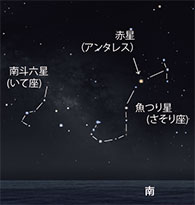 夏至を過ぎて間もない7月はまだ日暮れが遅く、西の空に星が見え始めるのは20時ごろからになります。まだ夕焼けの色が残る空にいち早く輝き始めるのは、明るい春の大三角の星々です。一番高いところで輝く麦星、アークトゥルスは、ひときわ明るくそのオレンジ色が目を引きます。麦星から北の方に目を移すと、大きな柄杓形をした北斗七星が見つかります。そうして視界を広くして大きく空を見渡すと、春の大曲線が見えてくるでしょう。季節が夏に移り変わってきて、深夜には春の星々は水平線に沈んでいきます。一方、南の方に目を移すと、低い空に明るく輝く赤星と、釣り針のような形をした魚つり星、さそり座が見えてきます。釣り針の先、サソリの尻尾の辺りは天の川が最も濃くなるところで、その東側には、北斗七星そっくりな形の南斗六星がひっそりと輝きます。北斗七星は死を司り、南斗六星は生を司るとされます。ともすると当たり前になってしまう「生」ですが、意識すると見えてくる南斗六星のように、「生」についても意識すると、さまざまなことが見えてくるように思います。