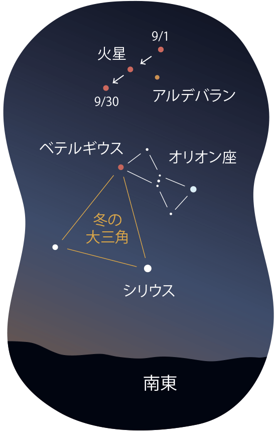深夜になると、東の空に赤く輝く火星が姿を見せます。火星は地球のすぐ外側で太陽を廻る惑星ですが、太陽・地球と一直線に並んで地球に接近するタイミング(会合周期)が惑星の中で最も長く、2年2ヶ月に一度しか明るく見えるタイミングがやってきません。そのタイミングが今年12月1日にやってくるため、いま火星は日に日に明るさを増してきています。明け方の空では、明るい冬の1等星たちと一緒に南東の空で輝きます。毎日アルデバランとの位置関係を見ていくと、星座をつくる星々とは違う、惑星ならではの動きを見ることもできます。
