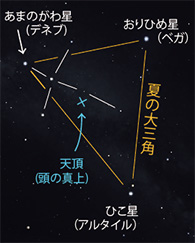 日没後、まだ夕焼けの残る低い西の空に輝きだす星は、麦星、アークトゥルスです。春は東の空に現れて一晩中輝き、初夏、麦の刈り入れ時には日暮れとともに天頂で輝きだすこの星は、熟れた麦のようなオレンジ色をしているのが特徴です。同じ1等星でも夏の大三角の星々より、もう一段明るくよく目立ちますが、半年のあいだよく見えていたこの星も、そろそろ見納めとなってきました。麦星から北の方に目を向けると、ヒシャク形の北斗七星の、柄の曲線が見えてきます。ただ、麦星より暗い2等星や3等星でできた北斗七星は、低いところの星は空の霞みでよく見えないかもしれません。ヒシャクの先の二星を結んで延ばしていくと、いつも真北で輝き、方角の指針となる北極星を見つけることができますが、この二星が見えないときは、カシオペヤ座を頼りにすることができます。ちょうど図の頃は角張った数字の3のような形に見えるカシオペヤ座は、深夜になると反時計回りに北極星の上のあたりまで移動し、アルファベットのMのような形に見えます。その姿から日本には、やまがた星という名前が伝わっています。夏頃は反対に低い空にW字形に見えることから、船の碇に見立てたいかり星という名前も伝わります。カシオペヤ座は、ちょうど天の川の通り道です。目の端を意識して空全体をぼんやりと眺め、薄雲のような筋が見えてきたら、それが天の川です。天頂の夏の大三角から南北に大空をまたいで流れる天の川は、9月の夜空の見どころなので、月明かりのない晴れた夜は、ぜひ見にいってみてください。
