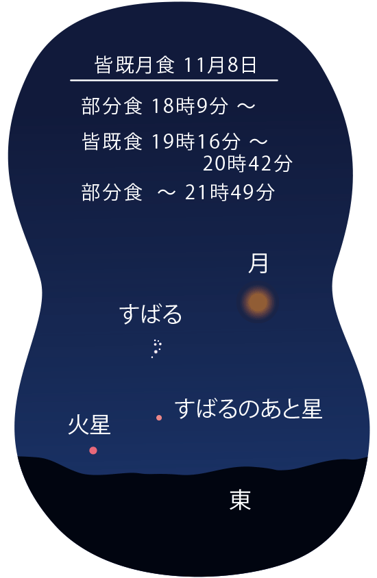 今月は20時を過ぎると、東から南、西の空へと、大きな弧を描くように明るい惑星が点々と並び、輝いています。東から順に火星・木星・土星です。月は毎日、形を変えながら夜空を大きく動いていきますが、その通り道は惑星の描く弧とほぼ重なります。月はこの弧上で毎月一度、それぞれの惑星たちと接近遭遇するのです。明るい惑星と月がセットで輝く姿を、毎日追いかけて見るのも面白いものです。今月は8日に満月となりますが、この日、月は地球の影に入り込み、皆既月食が起こります。滅多に見られない赤銅色の満月です。ぜひ眺めてみて下さい。