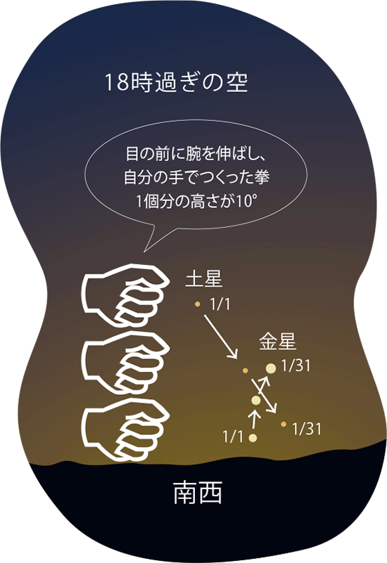1月は、日の入りから30分もすると、西の低い空に宵の明星・金星が輝きだします。上旬はまだとても低いところにあるので、その20°上空にある土星の方がよく見えるかもしれません。金星は日に日に高度が高くなり、土星は逆に高度が低くなっていきます。二惑星は22日,23日に、くっつくように並びます。また23日はその左下に、二日月も寄り添います。新月の翌日に現れる二日月は、あまりにも細く、またすぐ沈むので普段なかなか気づけません。でも今月は明るい金星を頼りにすると、きっと見つけられるでしょう。夕空の星々にも、ぜひ注目を。