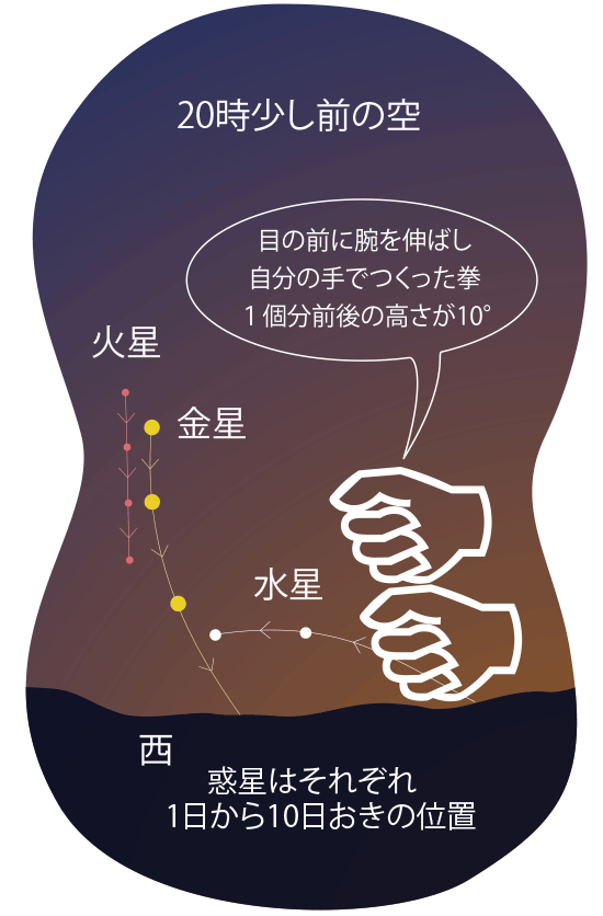 先月から日に日に近づくようすが見られていた金星と火星が、月初に最接近します。その後、金星は急速に高度を下げはじめ、下旬には見るのが難しくなります。金星は今年に入ってずっと宵の明星として見えていましたが、8月下旬に明けの明星として早朝の東の空に姿を見せるまで、しばらく見えない期間に入ります。春先は1等星の輝きを見せていた火星は、2等まで暗くなり存在感が薄れてきています。下旬の10日間は、この二惑星の間に割り込むように水星が姿を現します。日没後間もない水平線から10°前後の低い西の空にも、注目してみてください。