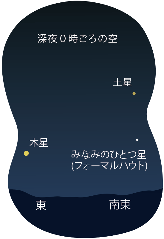 今年に入りずっと宵の明星として見えていた金星が、今月中旬に太陽と同じ方向にになる、つまり地球から夜空に見えない期間に入ります。その後下旬になると、明け方、日の出前の東の低い空に明けの明星として見えるようになります。一方、今月は深夜になると東の空に木星が昇ってきて、金星には及ばないもののとても明るく、おりひめ星の10倍もの明るさで輝きます。地球より内側で太陽を廻る金星は、明け方か夕方の低い空にのみ見えますが、外側を廻る木星は夜中にも見えることから、夜中の明星と呼ばれることもあります。