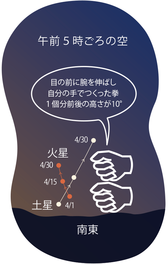 4月は南東の低い空に、火星と土星が輝きます。どちらも1等星の輝きで、日の出少し前の白みはじめる空に密かに姿を見せます。特に6日は新月前の細い月がそばで輝き、珍しい星景になります。また、毎日移動するこの二惑星は11日に最も接近し、延ばした腕先の小指で隠せるほどの近さになり、注目です。その後、土星は日に日に高さが増して見えやすくなっていく一方、火星の高度はなかなか上がらず、二星はどんどん離れていきます。日々日の出が早くなるので、4月下旬は4時半過ぎが見ごろです。早くに目が覚めた方は、どうぞ探してみてください。