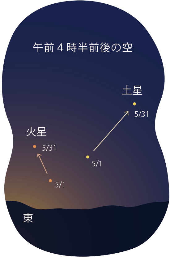 先月に続き今月も、夜明け前の東の空に火星と土星が輝きます。どちらも1等星の輝きで、月初は午前4時ごろから、月末は3時ごろから日の出30分前くらいまで見られます。特に4日は土星のそばに、5日は火星のそばに、新月前の細い月が寄り添うので、風情のある明けの空が見られるでしょう。頭上には、夏の大三角も明るく輝きます。また6日は深夜から火星が昇ってくるくらいまでの時間帯に、みずがめ座流星群がピークとなります。明け方の空にも、どうぞ注目してみて下さい。