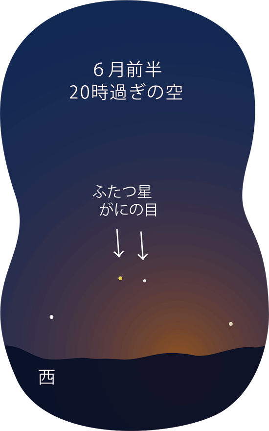 日没から30分くらいすると、まだ夕焼けの残る西の空に、少しの間だけ冬の星々が輝きます。6月前半なら八の字形に4個が、後半になると中の2個のみが見えるでしょう。この二星はふたご座の明星ですが、日本にはふたつ星、がにのめ(蟹の目)といった名前が伝わっています。一方明け方は4時を過ぎると白み始めますが、朝焼けの空に惑星が輝きます。月前半は南東に土星、東に火星が、後半になると加えて東北東の低い空に、木星も姿を見せます。木星は火星や土星の15倍も明るく輝くので、日の出直前まで見ることができるでしょう。