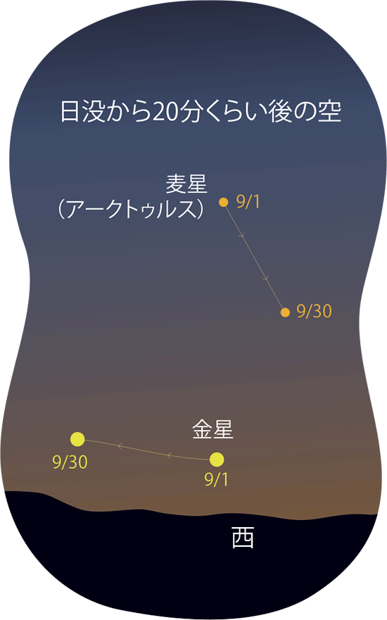 9月に入ると、西の低い空に金星が見えるようになってきます。宵の明星ともよばれる金星は、星座をつくる恒星よりはるかに明るく、日没から15分くらいすると、いち早く夕焼け空に輝きはじめます。まだ薄明るい空に輝く金星ならではの輝き、ぜひ楽しんでみてください。宵の明星は、これから3月まで楽しめます。金星に次いで明るい星は、木星です。9月に入ると、深夜0時ごろに東の空に昇ってきます。宵と明けの空にしか見えない内惑星の金星と違い、外惑星の木星は、夜中に見ることができるので、夜中の明星ともよばれます。