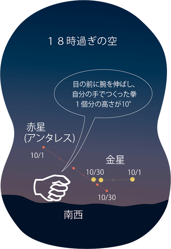 10月に入ると、宵の明星・金星がだいぶ見えやすくなってきます。日没から15分くらいすると夕空に見えはじめ、さらにもう10分ほどすると近くに赤星(さそり座の1等星アンタレス)も輝きはじめます。二星は日に日に近づいて、下旬は寄り添って輝きます。水平線から10°という低い空ですが、ひときわ明るい宵の明星はきっと見つけられるでしょう。また15日は、後の月、十三夜です。日本では中秋の十五夜(今年は9月17日)とセットで、月を愛でてきた日です。今年は、少し欠けて趣のある月に、土星が寄り添って輝きます。