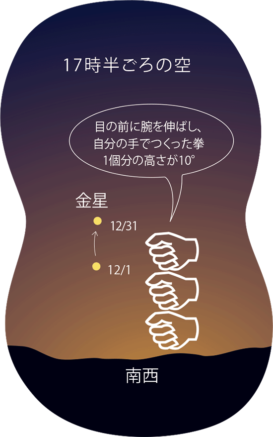 西の空では、日没から間もなく金星が明るく輝きはじめ、宵のうち、20時ごろまでは楽しめます。日暮れが早くなる分、宵のうちは夏の1等星を見ることもできます。とはいえすぐに沈んでしまうので、夏の大三角を見たいならば19時ごろまでに見に行くとよいでしょう。夏の大三角が見つかると、その一角を担うあまのがわ星(デネブ)を頂にした、十文字星も見えてきます。立ち上がる十字架のようなその姿は、クリスマスシーズンにピッタリな星空です。あまのがわ星はまさしく天の川の中で輝いている星で、そこから七夕の星の方への流れは夏の天の川ですが、反対のやまがた星(カシオペヤ座)の方へも流れは続いており、こちらが冬の天の川となります。その流れは東の空の五角星(ぎょしゃ座)、冬の大三角へと続きます。これからのシーズンは、こちらの天の川に注目です。頭上には、秋の四辺形がポッカリと浮かんでおり、近くには土星も明るく輝いています。秋の四辺形と土星を結んだ先、南の低い空には秋の1等星みなみのひとつ星も輝いています。いつもはひとつポツンと輝く星ですが、今月は土星と金星が近くで輝き、いつもよりにぎやかな星空となっています。