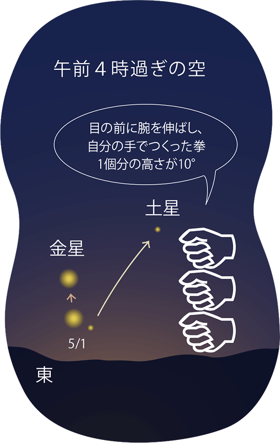 5月前半は、日没から30分くらいすると、夕焼けの残る西の空で2個の明るい星が輝きだします。北寄りの星が惑星の木星で、南寄りの星が冬の1等星シリウス、星座をつくる星(恒星)の中で最も明るく見える星です。月前半は明るいこの二星と、その間にはオリオン座の赤い1等星ベテルギウスも見られますが、星座をつくる星は毎日1度ずつ早く沈んでいくので、5月後半は低い空に木星のみが輝いているでしょう。木星も今月が見納めとなります。十分に暗くなった西の空によく輝いて見えるのは、ふたご座としし座の明るい星、そして火星です。双子の頭の星であるポルックスとカストルは、東の空に昇ってくるときは、兄カストル、弟ポルックスの順に現れます。しかし西の空では並んで一緒に沈んでゆくので、仲の良さを感じさせます。日本でも兄弟(おとどい)星や夫婦(みょうと)星といった名前が伝わっており、対の星として見られていました。しし座は春の星座として最初に昇ってくる星座で、5月に入るといち早く南から西へと傾いてきます。獅子の心臓で輝く1等星レグルスと、西洋鎌に似た頭の部分が特徴的で、十分に暗い星空なら初めてでも見つけ出せるでしょう。ポルックスとレグルスの間で輝く、赤い星が火星です。「惑星」は星座の中を日々行き惑うよう動くことからその名が付いていますが、火星は惑星の中でも特に早く動きます。先月は双子の星と並んでいた火星が、今月はポルックスからレグルスに日々寄っていき、少しずつ暗くなっていきます。今月も10日おきくらいに火星の位置を追っていくとおもしろいでしょう。6月17、18日には、火星はレグルスに超接近します。