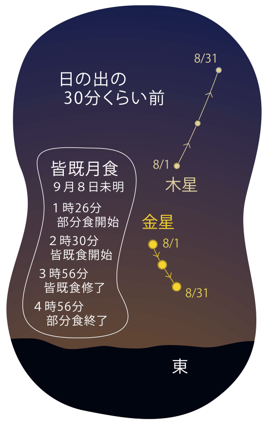 初夏からよく見えていた明けの明星・金星が、今月も明け方に東の空で輝きます。日の出がだいぶ遅くなってきたので、月末には5時半過ぎまで見ることができるでしょう。金星の上空には、金星に次いで明るい木星も輝いています。月初と月末では、この二惑星の距離がずいぶん違うので、空の印象はかなり違うでしょう。また今月の満月は8日ですが、この日、日本全国で皆既月食が起こります。月食は月が地球の影に入る現象で、皆既の間は、地球の大気を屈折して通り抜けた赤い光だけが月を微かに照らし、幻想的な姿を見せます。