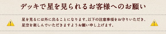 - 外部デッキの暴露部は波しぶきがかかったり、潮風で濡れていることが多く、大変滑りやすくなっていますのでスリッパやサンダル等すべり易い履物は着用しないで下さい。また、デッキは海面上20m以上あること、万が一夜間航海中に海中転落されますと発見が困難であることから、手すりに寄りかからないようお願い申し上げます。