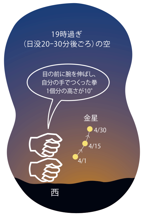 4月に入ると、日没時の金星の高度がだいぶ高くなり、見えやすくなってきます。星は、日没から30分くらすると1等星から順に見えてきますが、宵の明星とも言われる金星は、1等星よりはるかに明るいので、日没から15分くらいすると見えはじめます。まだほの明るい夕焼け空に輝きはじめる金星が、徐々に下りてくる夜のとばりの中で輝きを増していくようすは、空の変化が美しい日没直後のマジックアワーを、もう一段楽しい時間にしてくれます。19日には三日月も金星のそばに並び、さらに華やかな黄昏となります。