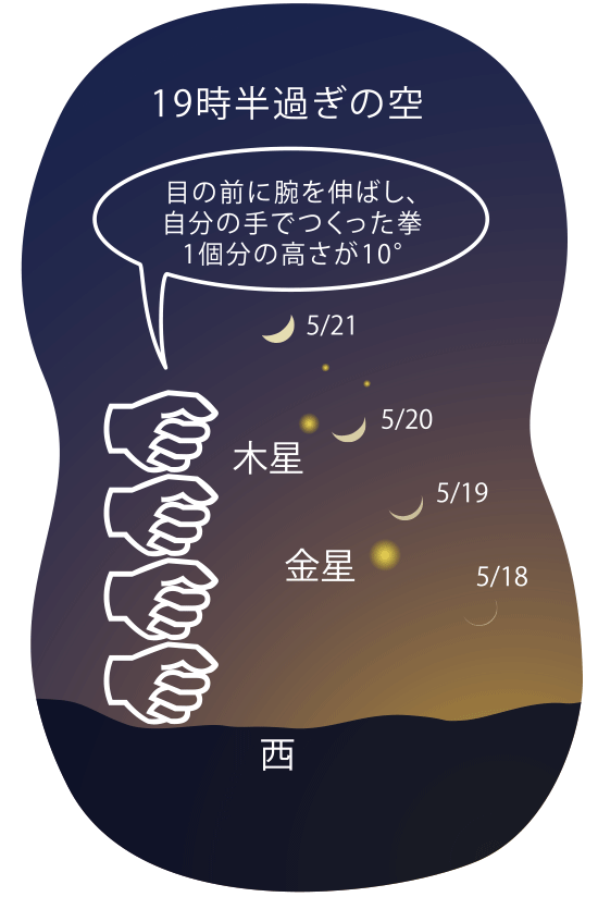 4月からよく見えるようになってきた宵の明星・金星が、5月は更に高く見えやすくなってきます。一方、金星に次いで明るく輝く木星は、徐々に高度が下がってきて、今月の宵の空では両惑星が日に日に近づいていきます。6月9日に両惑星は、夕空で超接近して輝きます。惑星はみな太陽を廻る面がほぼ同じなので、地球の空で太陽とほぼ同じルートを移動して、ときどき接近して見えるのです。月の軌道面も似ているので、18〜21日には、細い月が二惑星の近くを通りすがります。
