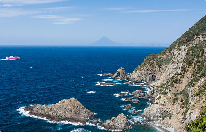大隅半島の最南端にある北緯31度線上に位置する本土最南端の岬。南端の断崖から50メートル沖の大輪島に日本最古の灯台の1つ「佐多岬灯台」があります。この場所は、霧島錦江湾国立公園に含まれ、天気が良ければ屋久島や種子島を望むこともできます。