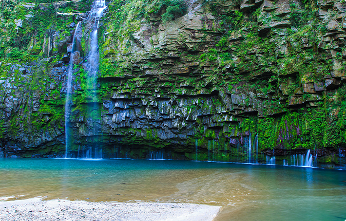 南大隅町の根占地区を流れる雄川上流にある落差46m、幅60mの滝です。近くの駐車場から滝壺までは約1200mの遊歩道があり、渓流の音に癒されながら自然と一体になれる癒しの隠れたスポットです。