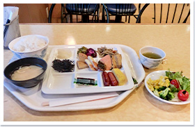 出発前に朝食をいただく。昨年とメニューが変わってバイキング形式になっていましたが、種類も豊富で値段が600円!と大変リーズナブルな内容もあってか、すぐ満席になってしまいました。利用される場合は早めに行った方が良いと思います。