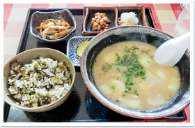 ソロ(一人)ツーリングは、マス(集団)ツーリングと違い、自分だけのペースで走れるため、気分が良いと、ほとんど休憩せずに走りっぱなしになってしまいます。今回も、昼に「大観峰」に到着するまで、4時間ほとんど休憩なしだったため、へろへろになってしまいました。朝から水以外何も口にしていなかったので、名物「だご汁定食」を食することとします。素朴な味で胃袋にやさしくしみ渡ります。