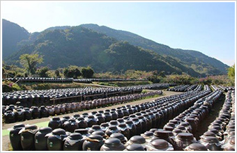 外に出られるようになっていて、一つ一つに仕込みした日付が貼られてある壺の周りを歩いて散策できるようになっていました。利用しませんでしたが、2階には黒酢料理を楽しめるレストランがありました。