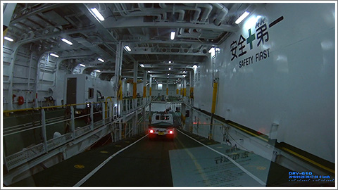 ターミナルで車検証と乗船名簿を持参して乗船手続きを済ませ、窓口で受け取った客室のカードキーと、行き先が印刷された紙を持って自動車に戻ります。その紙は誘導員の方からよく見えるようにダッシュボードに置き、2名分のカードキーは誘導員の方が携帯しているバーコードリーダー(?)のような機器で読み取られ、おそらくこれが確かに乗船しましたという確認になるのでしょうか。しばらくすると乗船の時が来て、誘導員の方の指示に従って船の可動橋を通り、3階に相当する車両デッキの中に進入します。