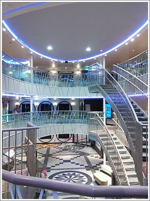 客室で必要な荷物だけ自動車から持って出て、エレベーターで「スイート」の部屋がある8階デッキまで一気に上がります。エレベーターのドアが開くと、そこは車両デッキの硬い雰囲気とは全く違った優しい空間が待っていました。船内に入って先ず目につくのは、何と言ってもエントランスホールの3フロア(6~8階)吹き抜けのアトリウム。