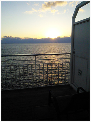 マイカーを利用した新造船のモニターツアーは当初、秋に予定していましたが、事情により真冬の1月下旬に変更。旅行期間中の天気予報は、全国的に寒波が到来し、関西の平地でも雪になるかもしれないということで、念のためタイヤチェーンを車に載せて「きりしま」に乗船。志布志港を離岸する時、10名程のターミナル職員の皆さんが青いライトを振りながらいつまでもいつまでも見送ってくれます。私たち夫婦も負けじと客室の専用バルコニーから手を振り返します。これほど手を振り続けたのは何十年ぶりでしょうか。船内アナウンスでは、往復に同じフェリーを利用する「弾丸ツアー」での伊勢方面への団体さんがおられるとのこと。フェリーを利用するとそのような楽しみ方もあるのだと感心。