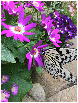 翌朝、大阪南港で下船。梅田を過ぎて新御堂筋の突き当たりまでひたすら北上。阪急箕面駅近くの駐車場から箕面大滝まで片道3.1kmの滝道を頑張って歩きます。15分ほど歩いたところに「箕面昆虫館」。ここの館長さんはユニークな方のようで、ひと味違う標本展示でした。館長さんの研究グループが同定した琥珀中の新種の昆虫の学名がカマキリ先生としても有名な俳優の香川照之さんの名前に由来しているとか。四季折々の植物の中、たくさんの蝶が飛び交っている放蝶園(温室)では、ゆったりと楽しむことができました。