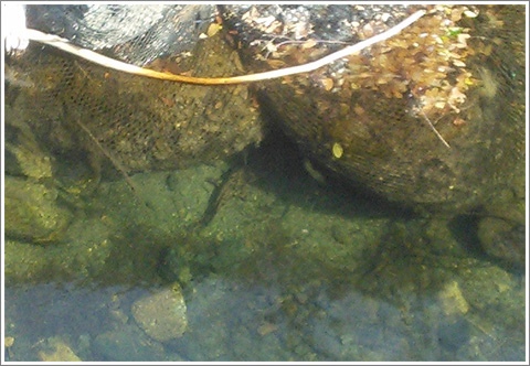 昆虫館を出てしばらく歩いていると、滝道沿いを流れている箕面川の水面を大勢の観光客が覗き込んでいました。近寄って尋ねてみると、川底に天然記念物のオオサンショウウオがいるとのこと。このあたりのオオサンショウウオを知る人の話では、いつもはもっと上流に生息しているらしいが、大雨で下流に流されるとのこと。箕面公園一帯は昨年9月に関西を直撃した台風21号で、大量の倒木や崩落など被害甚大だったとのことで、このオオサンショウウオもその時に流されてきたのかもしれません。