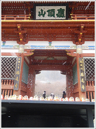 駐車場に戻り、箕面の山奥にあるパワースポットで「勝運の寺」「勝ちダルマ」の寺としても人気のある勝尾寺へと曲がりくねった山道をドライブ。勝尾寺に到着した頃には雪がかなり強く降ってきました。