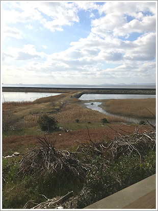 夕方になりフェリーの出港時刻が近づいてきました。大阪湾の海沿いの港湾幹線道路、阪神高速5号湾岸線を一気に走り抜けて大坂南港に到着。日曜日にもかかわらず、神戸三宮から大阪南港まで渋滞無く30分程度で戻れるのはとても助かりました。出航まで時間に少し余裕があったので、ターミナル近くの野鳥園に立ち寄ってみました。野鳥観察棟では多くの方が望遠レンズがついたカメラで遠くの干潟を狙っていました。出航までのんびり時間を過ごせる都会のオアシスのような場所でした。