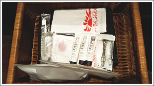 部屋には、アメニティーグッズもそろっていて、ドリップコーヒーやお茶とさんふらわあクッキー、冷蔵庫には冷えた鹿児島のミネラルウォーター(樵の分け前)が用意されています。