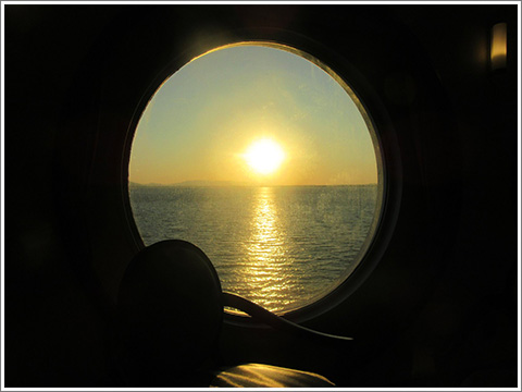 翌朝、6時半過ぎに目覚め、朝風呂を浴びる。航路は外洋を通っていたが、船の揺れは心地よいレベルで、睡眠を妨げるものではなく、熟睡できた。夜明けの海はどんよりしていたが、なにより海を眺めながらの入浴はとても気持ちがよい。アルコールはすっかり抜けたが、まだお腹いっぱいの感覚を引きずっている。やっぱり、昨夜は調子に乗って食べ過ぎちゃったことを再認識する。でも、満腹になるまで食べるってことは幸せなことでもあろうと、勝手に納得させている自分がいる。昼からも、鹿児島の美味しいものをたくさん食べる計画もあり、朝食はパス。給湯室のお湯を使って、持参のドリップコーヒーを淹れる。海を眺めながらのモーニングコーヒーもまた格別である。右舷には日南、大隅半島の海岸線を望めるようになる。今日も快晴。デッキに出て、朝の空気を思い切り吸い込む。寒いけれど、やっぱり気持ちいい。8時過ぎには志布志港湾に入っていき、定刻に志布志入港。連絡バスのさんふらわあライナーで11時過ぎには鹿児島につくことができた。
